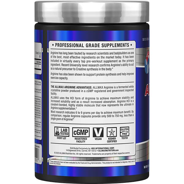 ALLMAX Arginine HCI is a highly potent nitric oxide–supporting amino acid supplement designed to promote blood flow, improve vascularity, and support intense training performance. As a semi-essential amino acid, L-Arginine is naturally produced by the body, but increased physical stress, training frequency, or performance demands often require higher levels than food alone can supply. Arginine HCI provides a pure, stable, and highly absorbable form engineered for athletes seeking high workout intensity, endurance, and muscle pump support.