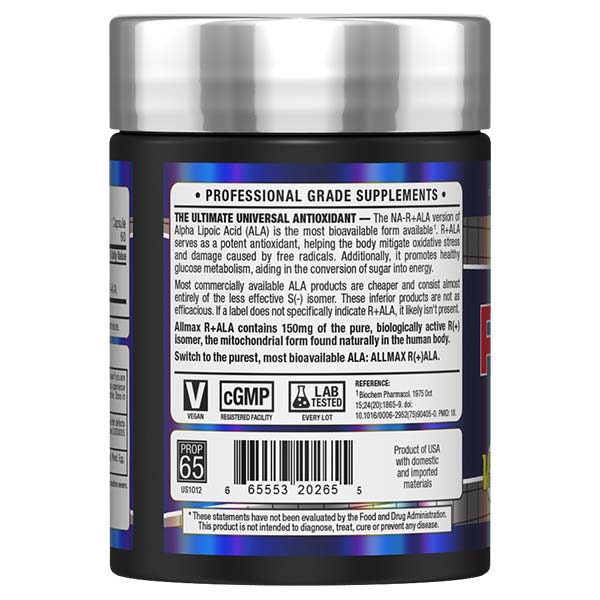 Allmax R+ALA delivers the purer, more bio-active form of Alpha Lipoic Acid—R-ALA—to support superior nutrient delivery, antioxidant defense, glucose metabolism, and improved performance. Unlike regular ALA, R+ALA features stabilized Na-R-ALA, offering dramatically better absorption and bioavailability.