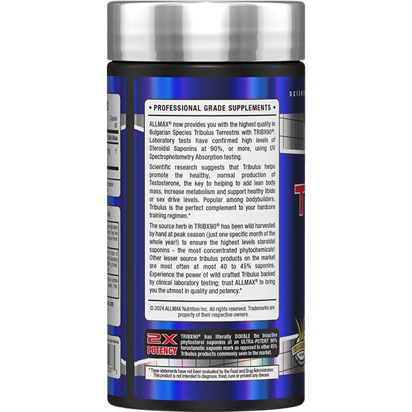 Allmax TribX90® delivers ultra-pure, ultra-potent Bulgarian Tribulus terrestris extract standardized to a massive 90% steroidal saponins, making it one of the most concentrated tribulus supplements available. Sourced from hand-harvested wild Bulgarian Tribulus at peak season, each capsule provides 750 mg of fruit extract, supplying 675 mg of standardized saponins that support natural hormone balance, strength, stamina, vitality, and libido. With more than double the saponin content of standard tribulus products, TribX90® is formulated for athletes and active individuals who demand high potency and real results.